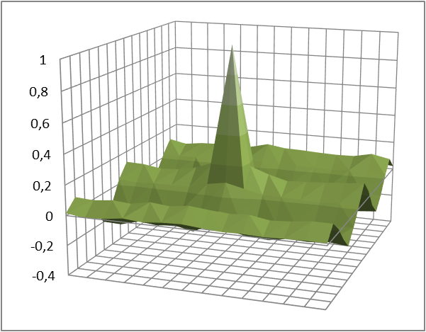 First of all, a very small row/column noise was detected on the dynamic darker part, as you can check with the line detected on the autocorrelation shape below. This very small row/column noise does not impact the incredible dynamic range at the base ISO, but as digital gain is applied to achieve higher ISO settings, it becomes significant, affecting noise levels (and the respective amount of spatial correlations), thereby decreasing dynamic range (as you would expect).