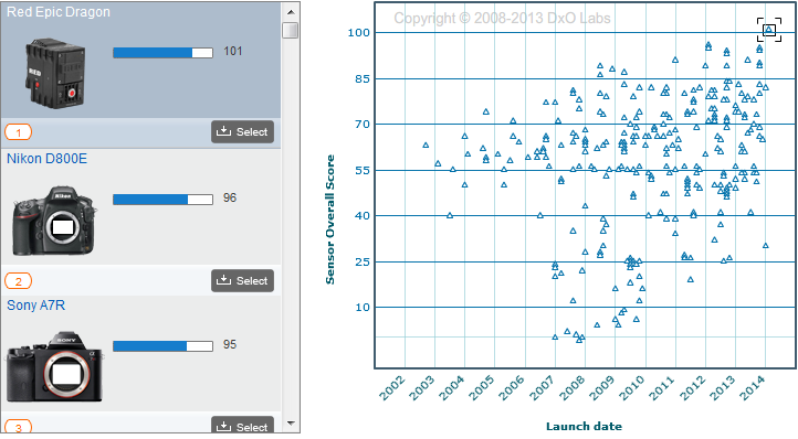 With a 5-point lead over the Nikon D800E which was the previous best-performing sensor in our database, the Epic Dragon achieves the highest DxOMark score we've seen to date, at 101 points. Given that the Dragon is the new reference for sensor quality, it's all the more impressive when you consider both its size (similar to an APS-H size sensor) and the fact that it shoots ultra-high frame rates at full resolution.
