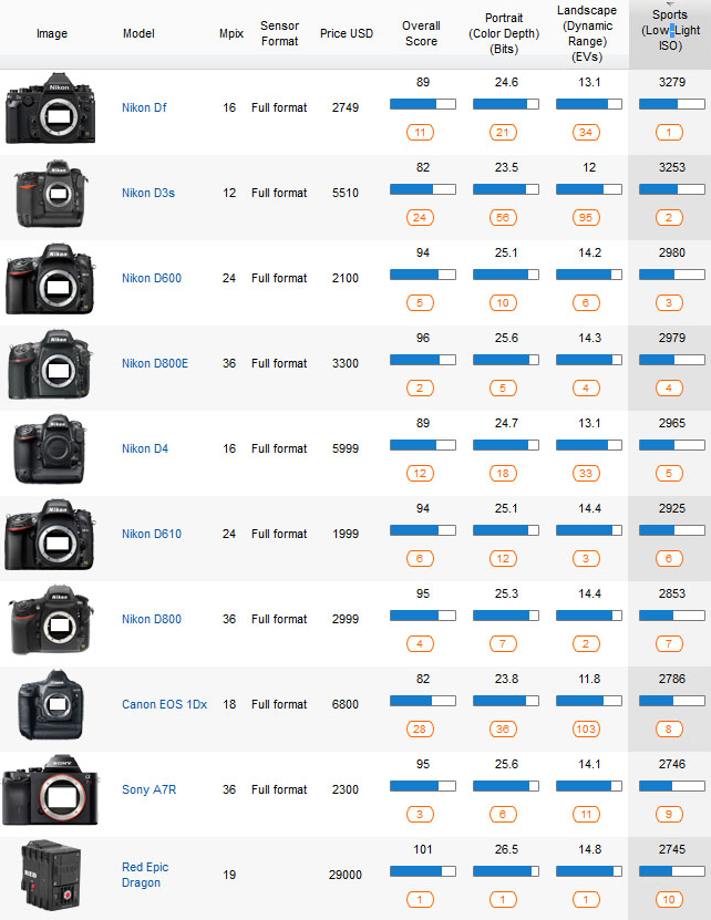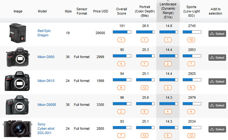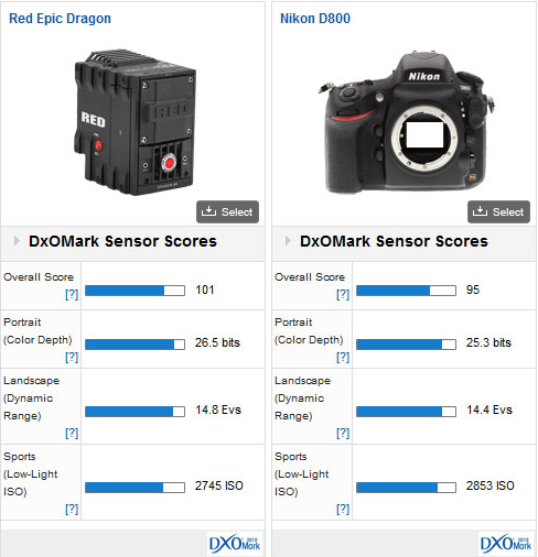 The RED EPIC DRAGON was placed in a side-by-side comparison to the Nikon D800, which had the highest ranked sensor score before being outscored by the DRAGON sensor: