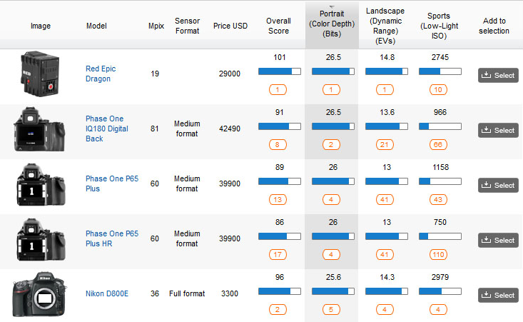 Thanks to exceptionally low noise levels at base ISO, which in turn accounts for the wide dynamic range and very high color depth, the Epic Dragon dethrones the 36-Mpix Nikon D800, Nikon D800E and Sony A7R from their previously held positions.