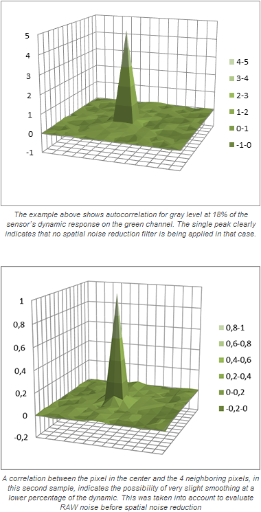 As illustrated in the following graphs, we did noticed a very slight spatial correlation in some parts of the dynamics, but nothing heavy-handed enough to impact score significantly. This is a real plus for image quality, as noise reduction filters lower spatial resolution and degrade the effectiveness of a RAW convertor's noise reduction capabilities (such as DxO Optics Pro's Prime Noise Reduction).