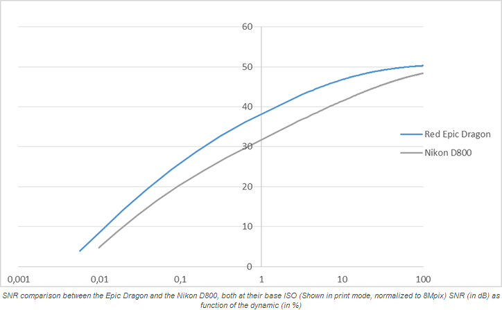 With a sensor area 0.56 x smaller by surface area than a 35mm (24 x 36 mm) full frame sensor, the results are very impressive. As the sensor and image processor can deliver very high frame rates, the Epic Dragon is certainly adopting multiple sampling techniques to reduce noise levels (also known as temporal noise reduction). Without such processing, such high SNR would only be possible from a sensor with an exceptional Full Well Capacity. Performances like this seem, to us, above the current technical capabilities of CMOS sensors.