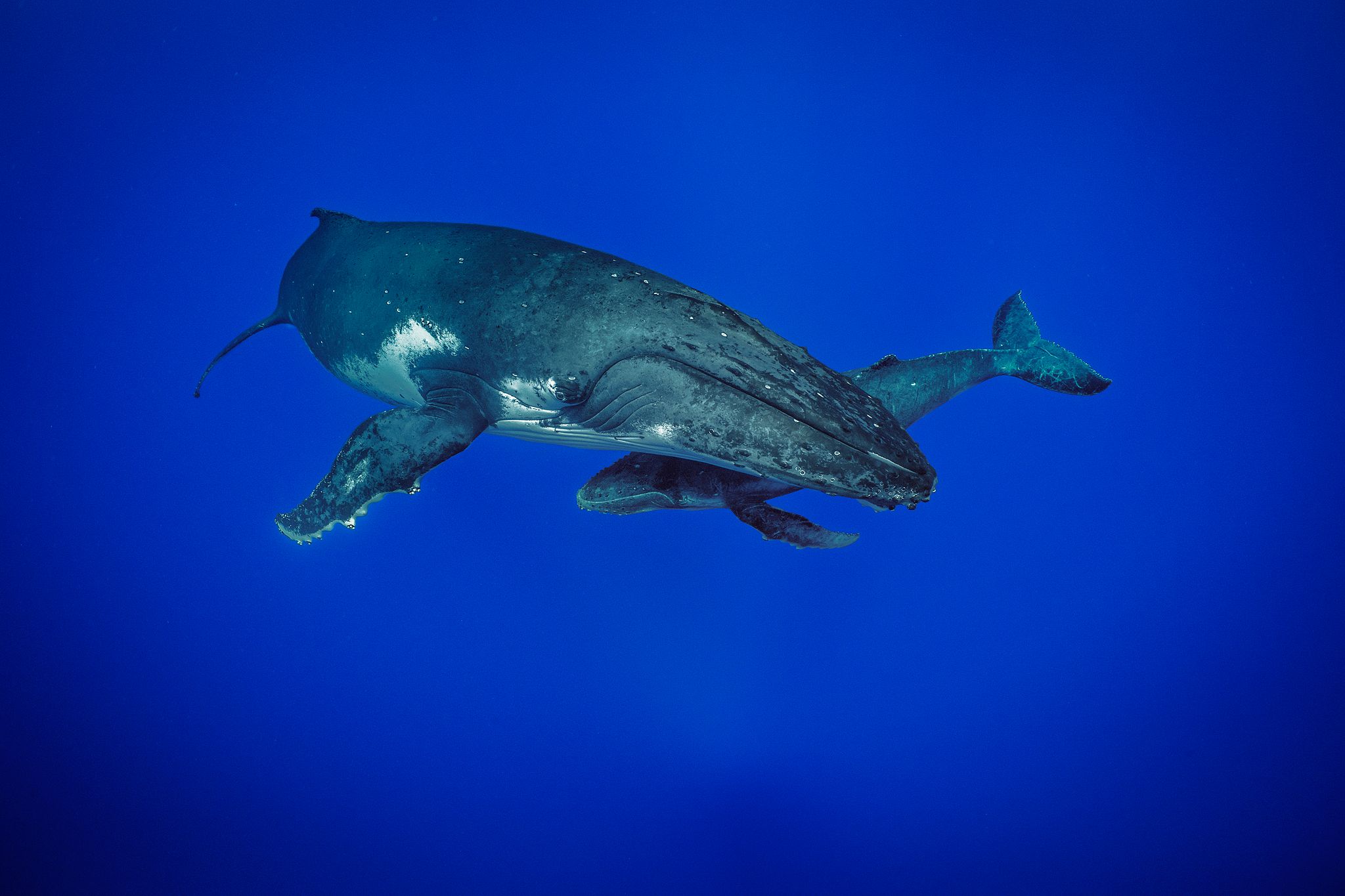 Taking great care not to disturb the whales, the team worked with camera operators skilled at filming while freediving to 60-to-70 feet. Filming at depths of 120 feet was accomplished using scuba tanks. Either way, light and color fades very quickly from surface.