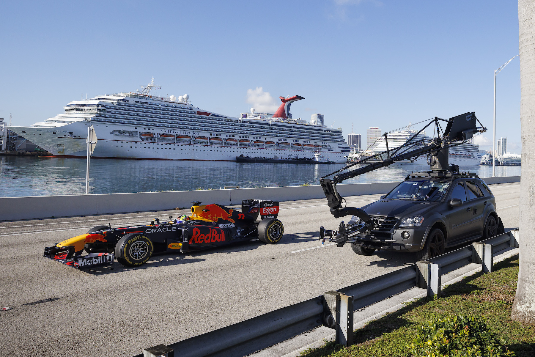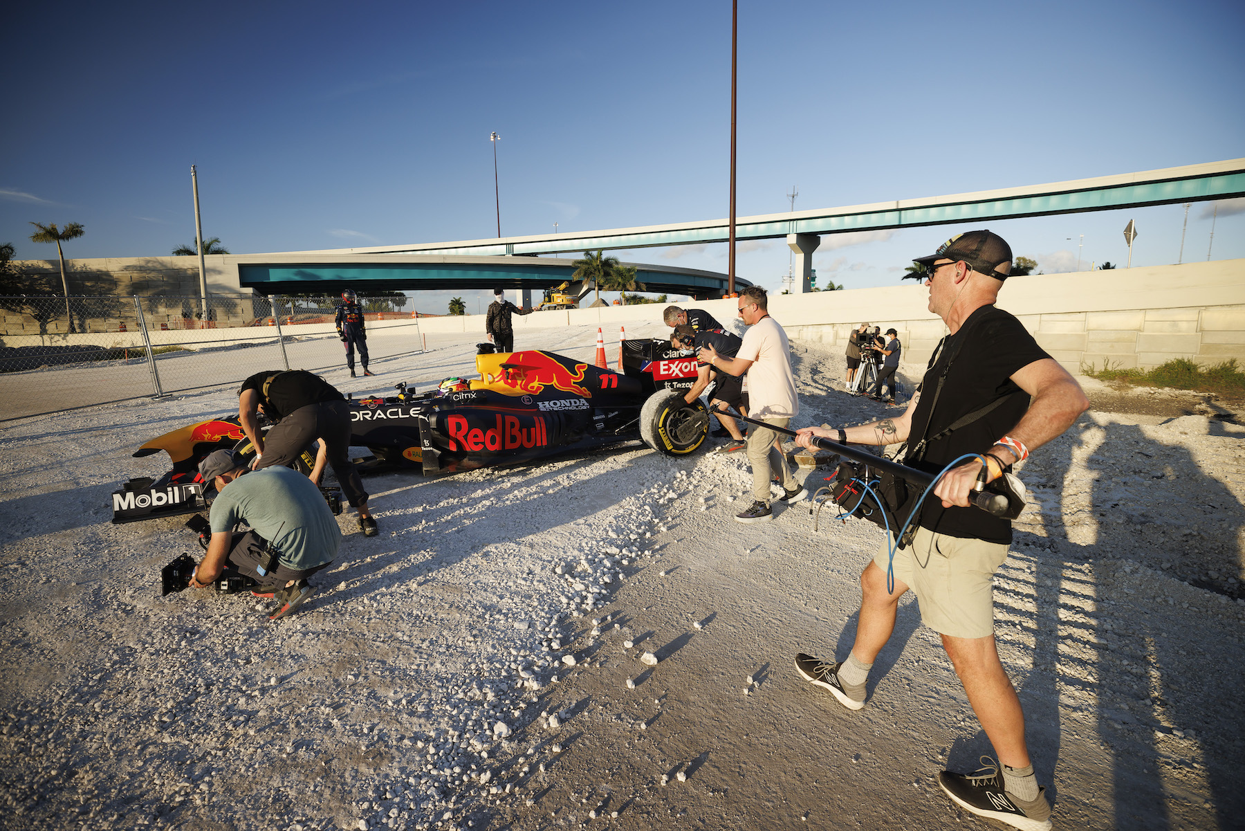 When the crew got to Miami, they were finally able to unleash the full power of the F1 car but capturing its sheer speed on film presented a problem. Even at 60-80 mph, which is sluggish for a F1 car, conventional filming equipment struggles to keep pace. The obvious answer was to use a drone.