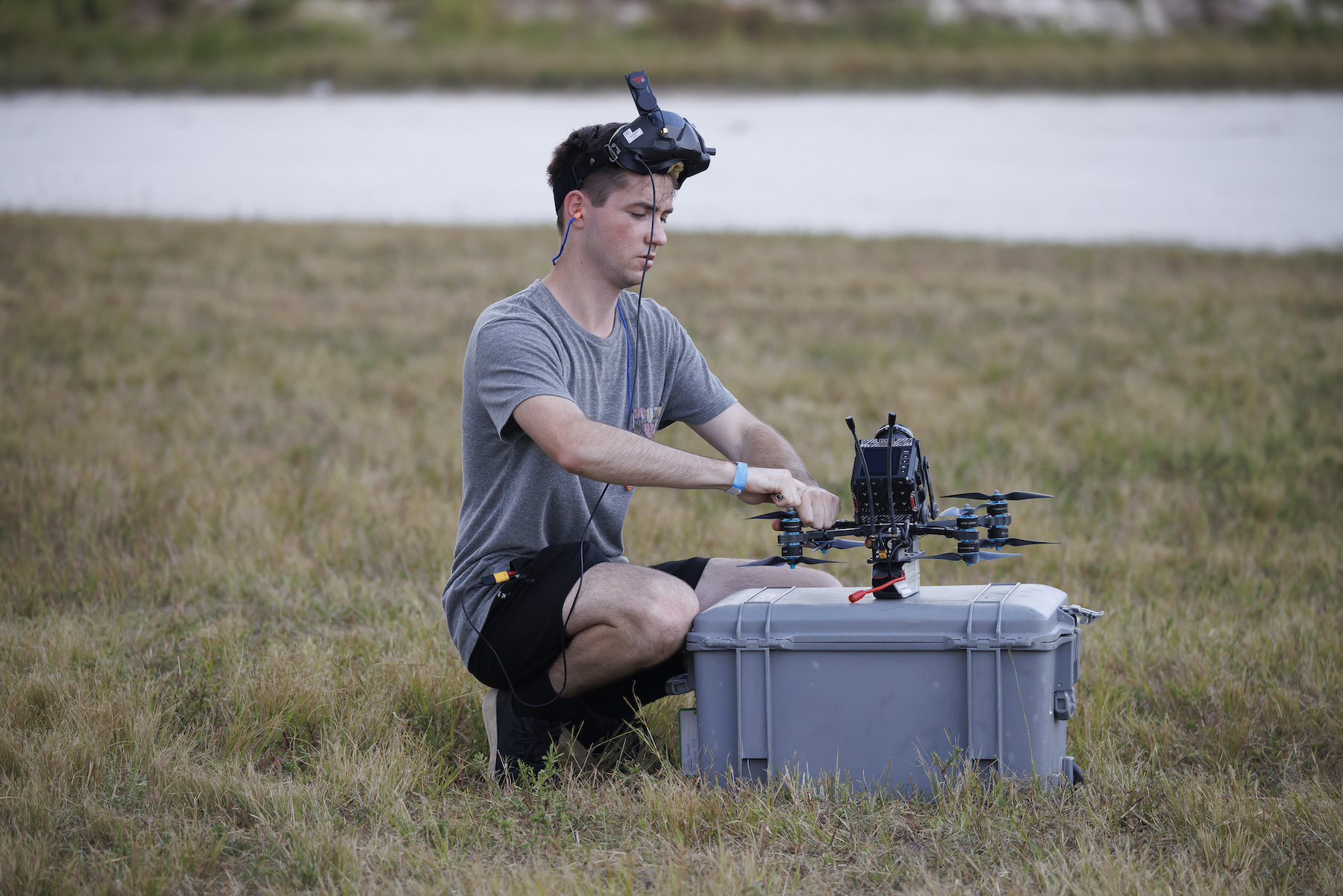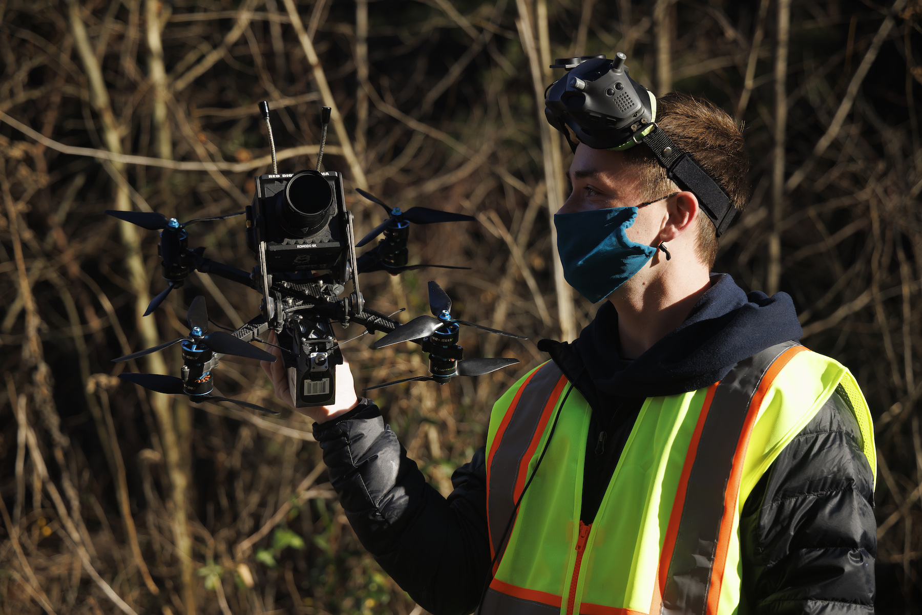 The FPV drone has a pilot camera on board which transmits live to Johnny’s monitor allowing him to fly the drone.