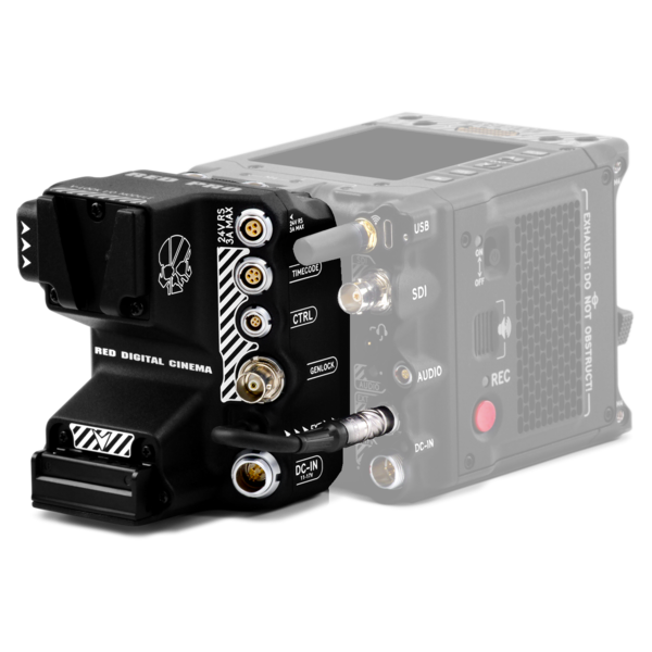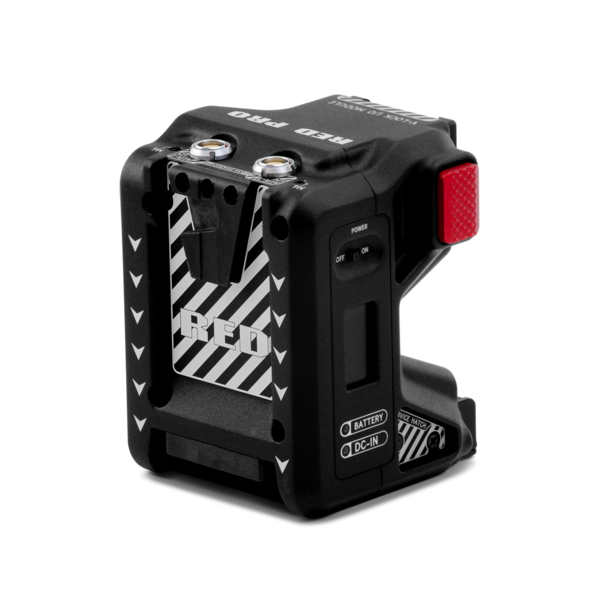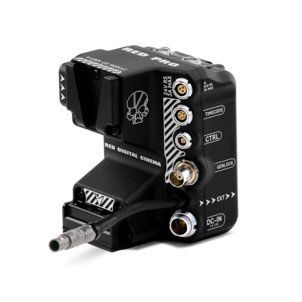 The RED® Pro V-Lock I/O Module offers a variety of input/ output connections, and it also includes an industry standard V-Lock mount to power your KOMODO-X with higher capacity batteries. This V-lock module mounts directly to the KOMODO-X’s rear Micro V-Lock plate and 9-Pin EXT Port, and it offers connections for the following: