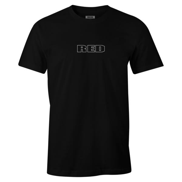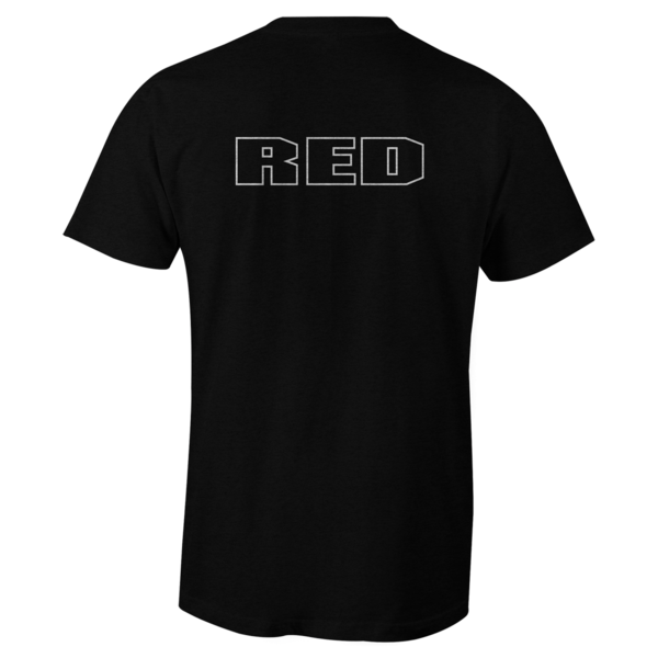 RED is boldly printed and outlined on the front and the back of the shirt.