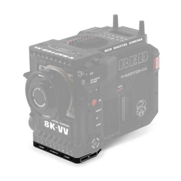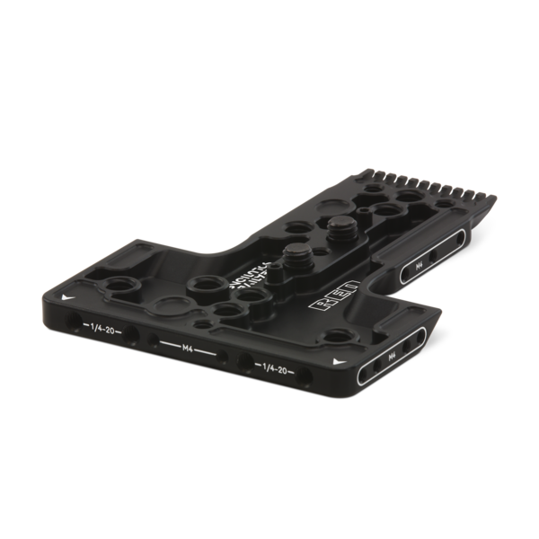 The V-RAPTOR® XL Riser Plate attaches to the bottom of the camera and allows you to attach standard 15 mm and 19 mm studio baseplates to reach the correct optical height. It also provides 1/4-20 and 3/8-16 mounting points for additional mounting configurations.